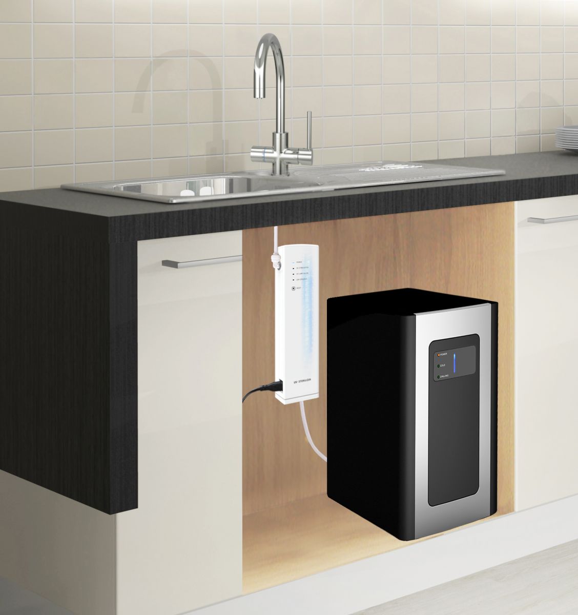 The external UV sterilizer can be installed at the place between outlet faucet and water dispenser to eliminate the bacteria from internal pipes and sparkling/cold water tanks. It makes sure that each cup of water is clean and tasty.