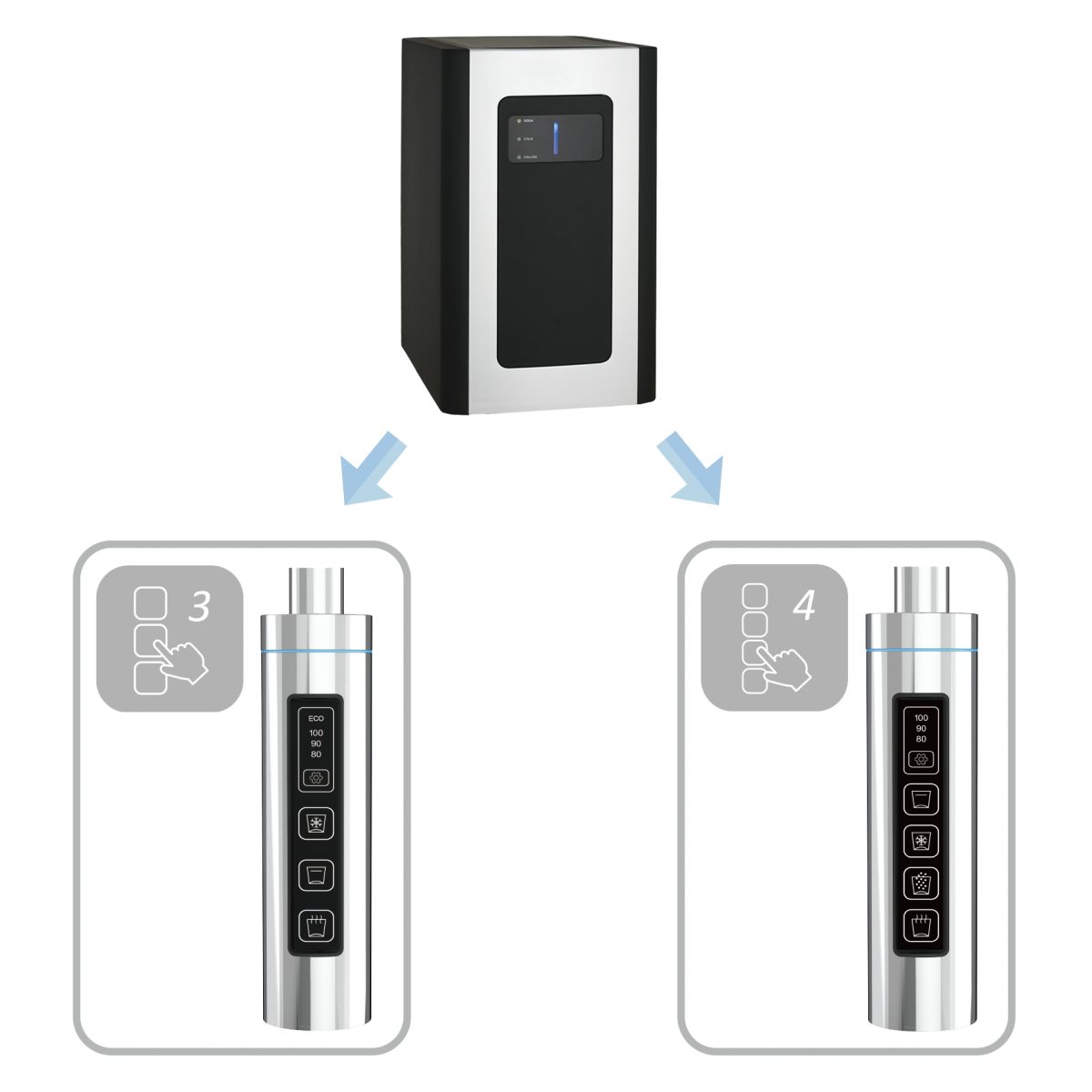 3 water option: cold/hot/sparkling, cold/ambient/sparkling, cold/hot/ambient